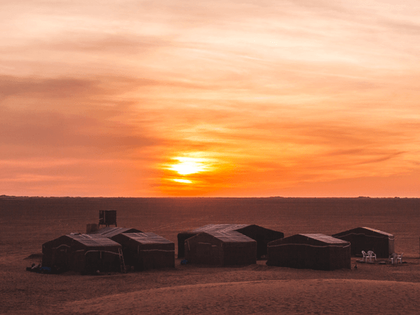 Te recogeremos en tu hotel y nos dirigiremos a Ouarzazate a través del paso Tizi n'Tichka a (2260 m de altitud). Luego, nos detendremos para visitar la antigua ciudad fortificada (ksar o kasbah) mejor conservada de Marruecos, Ait Ben Haddou, donde se han filmado muchas películas famosas como Gladiator, Lawrence de Arabia y Obelix. Continuaremos nuestra ruta hacia el valle del Draa antes de llegar a Zagora. Ahí serás recibido con una taza de té caliente, antes de prepararse para montar en camello. Pasarás la noche en una tienda bereber en el corazón de las dunas de arena.