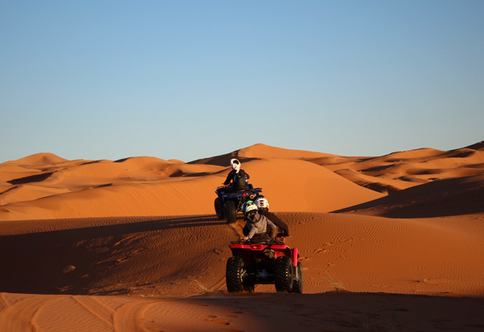 At this stage, straight after breakfast, we'll make a route on Paris-Dakar Rally style, visiting nomads of the desert, with which we'll take a cup of tea and see the oasis where it was shot some films like Sahara, starred by Penélope Cruz. We'll visit the village of “blacks”, so-called by the slave trade that brought from the Sudan. After lunch, we'll change the 4x4 traction for animal traction. On dromedaries, we'll enter the sea of dunes to contemplate an unforgettable sunset. At this special night, you'll sleep in a nomadic tent (jaima) in the dunes, as do the Berbers. Here, you'll enjoy a dinner Berber, music and a starry sky as you have ever seen. Accommodation in an unforgettable "jaima".